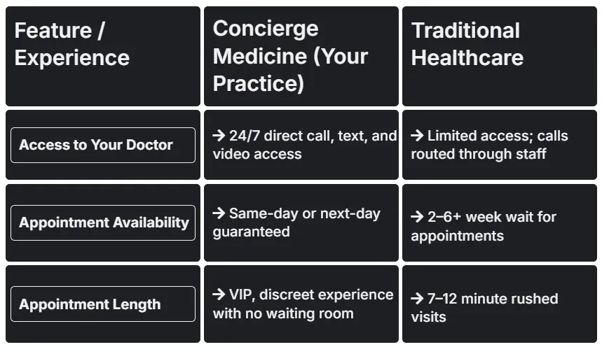 Your membership gives you direct access, no waiting, and immediate care — so you can focus on what actually matters.